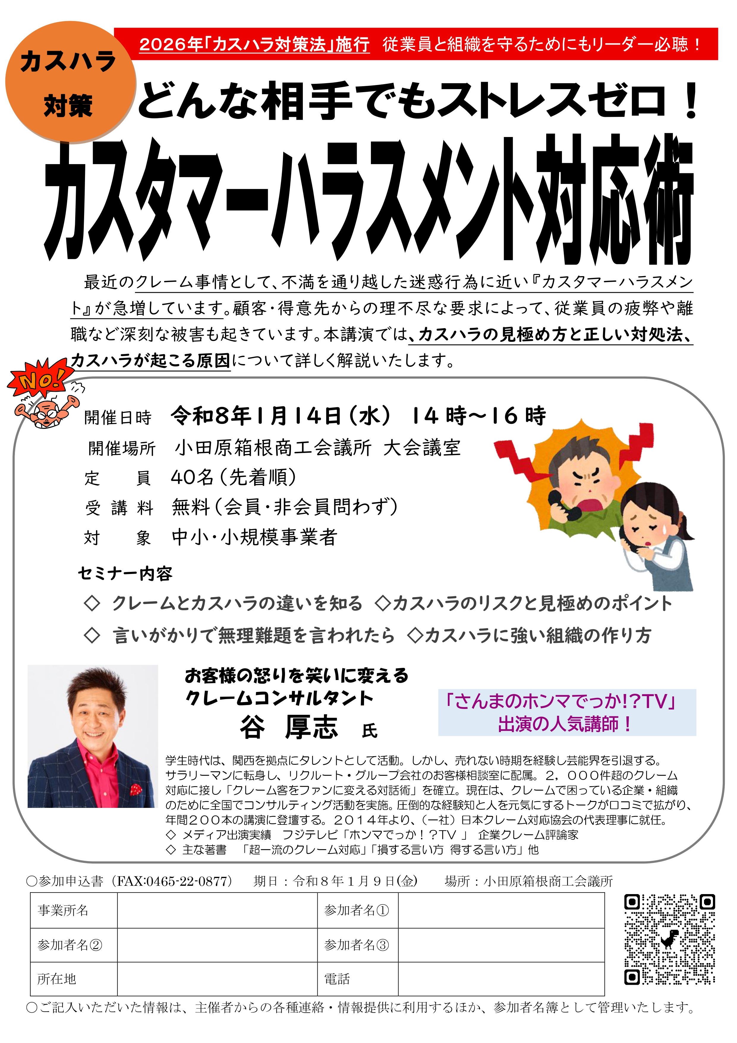 2026年「カスハラ対策法」施行されます。最近のクレーム事情として、不満を通り越した迷惑行為に近い『カスタマーハラスメント』が急増しています。顧客・得意先からの理不尽な要求によって、従業員の疲弊や離職など深刻な被害も起きています。本講演では、カスハラの見極め方と正しい対処法、カスハラが起こる原因について詳しく解説いたします。従業員と組織を守るためにもリーダー必聴です!