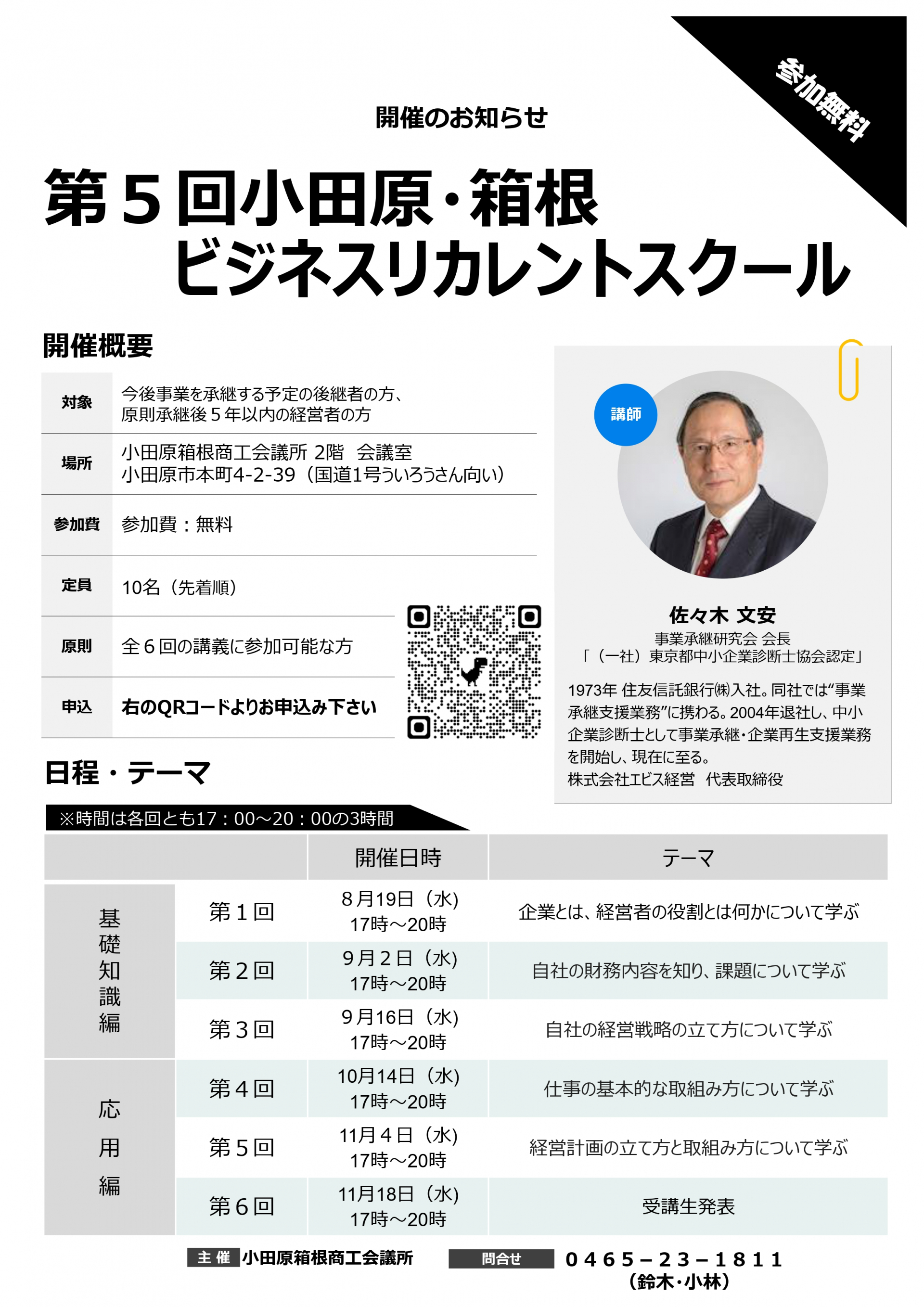 小田原箱根商工会議所では「今後事業を承継する予定の後継者の方」、「原則承継後5年以内の経営者の方」を対象にビジネスリカレントスクールを開催いたします。(全6回)